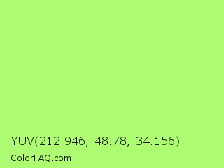 YUV 212.946,-48.78,-34.156 Color is a light green color and the nearest color is Sulu #c1f07c. Hex code #aefc72 and RGB value is rgb(174,252,114). In RGB color space, this color is composed of 68% red, 99% green, 45% blue, In CMYK color space, this color is composed of 31% cyan, 0% magenta, 55% yellow , 1% black , In HSL color space, this color has a hue angle of 94° , 96% saturation and 72% lightness.