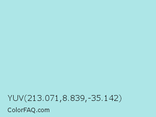 YUV 213.071,8.839,-35.142 Color is a light cyan color and the nearest color is Powder Blue #b0e0e6. Hex code #ade6e7 and RGB value is rgb(173,230,231). In RGB color space, this color is composed of 68% red, 90% green, 91% blue, In CMYK color space, this color is composed of 25% cyan, 0% magenta, 0% yellow , 9% black , In HSL color space, this color has a hue angle of 181° , 55% saturation and 79% lightness.