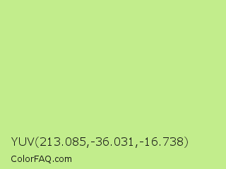 YUV 213.085,-36.031,-16.738 Color is a light green color and the nearest color is Sulu #c1f07c. Hex code #c2ed8c and RGB value is rgb(194,237,140). In RGB color space, this color is composed of 76% red, 93% green, 55% blue, In CMYK color space, this color is composed of 18% cyan, 0% magenta, 41% yellow , 7% black , In HSL color space, this color has a hue angle of 87° , 73% saturation and 74% lightness.