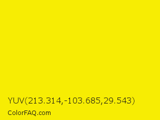 YUV 213.314,-103.685,29.543 Color is a normal yellow color and the nearest color is Aureolin #fdee00. Hex code #f7ed03 and RGB value is rgb(247,237,3). In RGB color space, this color is composed of 97% red, 93% green, 1% blue, In CMYK color space, this color is composed of 0% cyan, 4% magenta, 99% yellow , 3% black , In HSL color space, this color has a hue angle of 58° , 98% saturation and 49% lightness.