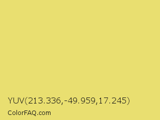YUV 213.336,-49.959,17.245 Color is a light yellow color and the nearest color is Straw #e4d96f. Hex code #e9df70 and RGB value is rgb(233,223,112). In RGB color space, this color is composed of 91% red, 87% green, 44% blue, In CMYK color space, this color is composed of 0% cyan, 4% magenta, 52% yellow , 9% black , In HSL color space, this color has a hue angle of 55° , 73% saturation and 68% lightness.