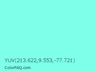 YUV 213.622,9.553,-77.721 Color is a light cyan color and the nearest color is Aquamarine #7fffd4. Hex code #7dffe9 and RGB value is rgb(125,255,233). In RGB color space, this color is composed of 49% red, 100% green, 91% blue, In CMYK color space, this color is composed of 51% cyan, 0% magenta, 9% yellow , 0% black , In HSL color space, this color has a hue angle of 170° , 100% saturation and 75% lightness.