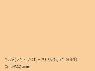 YUV 213.701,-29.926,31.834 Color is a light orange color and the nearest color is Peach Orange #ffcc99. Hex code #facf99 and RGB value is rgb(250,207,153). In RGB color space, this color is composed of 98% red, 81% green, 60% blue, In CMYK color space, this color is composed of 0% cyan, 17% magenta, 39% yellow , 2% black , In HSL color space, this color has a hue angle of 33° , 91% saturation and 79% lightness.