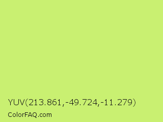 YUV 213.861,-49.724,-11.279 Color is a light lime color and the nearest color is Sulu #c1f07c. Hex code #c9f071 and RGB value is rgb(201,240,113). In RGB color space, this color is composed of 79% red, 94% green, 44% blue, In CMYK color space, this color is composed of 16% cyan, 0% magenta, 53% yellow , 6% black , In HSL color space, this color has a hue angle of 78° , 81% saturation and 69% lightness.