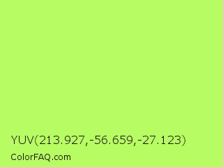 YUV 213.927,-56.659,-27.123 Color is a light green color and the nearest color is Inchworm #b2ec5d. Hex code #b7fc63 and RGB value is rgb(183,252,99). In RGB color space, this color is composed of 72% red, 99% green, 39% blue, In CMYK color space, this color is composed of 27% cyan, 0% magenta, 61% yellow , 1% black , In HSL color space, this color has a hue angle of 87° , 96% saturation and 69% lightness.