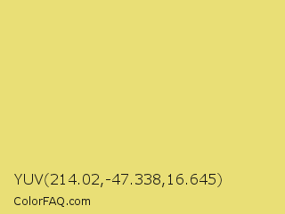 YUV 214.02,-47.338,16.645 Color is a light yellow color and the nearest color is Straw #e4d96f. Hex code #e9df76 and RGB value is rgb(233,223,118). In RGB color space, this color is composed of 91% red, 87% green, 46% blue, In CMYK color space, this color is composed of 0% cyan, 4% magenta, 49% yellow , 9% black , In HSL color space, this color has a hue angle of 55° , 72% saturation and 69% lightness.