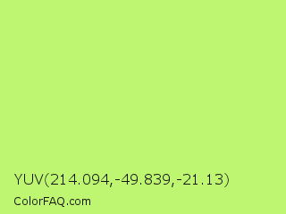 YUV 214.094,-49.839,-21.13 Color is a light green color and the nearest color is Sulu #c1f07c. Hex code #bef671 and RGB value is rgb(190,246,113). In RGB color space, this color is composed of 75% red, 96% green, 44% blue, In CMYK color space, this color is composed of 23% cyan, 0% magenta, 54% yellow , 4% black , In HSL color space, this color has a hue angle of 85° , 88% saturation and 70% lightness.