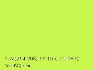 YUV 214.208,-66.165,-11.583 Color is a light lime color and the nearest color is Maximum Green Yellow #d9e650. Hex code #c9f750 and RGB value is rgb(201,247,80). In RGB color space, this color is composed of 79% red, 97% green, 31% blue, In CMYK color space, this color is composed of 19% cyan, 0% magenta, 68% yellow , 3% black , In HSL color space, this color has a hue angle of 77° , 91% saturation and 64% lightness.