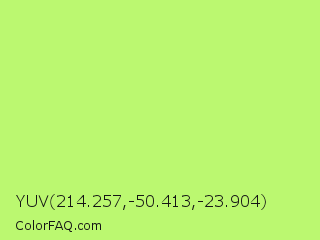 YUV 214.257,-50.413,-23.904 Color is a light green color and the nearest color is Sulu #c1f07c. Hex code #bbf870 and RGB value is rgb(187,248,112). In RGB color space, this color is composed of 73% red, 97% green, 44% blue, In CMYK color space, this color is composed of 25% cyan, 0% magenta, 55% yellow , 3% black , In HSL color space, this color has a hue angle of 87° , 91% saturation and 71% lightness.