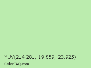 YUV 214.281,-19.859,-23.925 Color is a light green color and the nearest color is Madang #b7f0be. Hex code #bbecae and RGB value is rgb(187,236,174). In RGB color space, this color is composed of 73% red, 93% green, 68% blue, In CMYK color space, this color is composed of 21% cyan, 0% magenta, 26% yellow , 7% black , In HSL color space, this color has a hue angle of 107° , 62% saturation and 80% lightness.