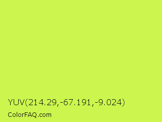 YUV 214.29,-67.191,-9.024 Color is a light lime color and the nearest color is Maximum Green Yellow #d9e650. Hex code #ccf64e and RGB value is rgb(204,246,78). In RGB color space, this color is composed of 80% red, 96% green, 31% blue, In CMYK color space, this color is composed of 17% cyan, 0% magenta, 68% yellow , 4% black , In HSL color space, this color has a hue angle of 75° , 90% saturation and 64% lightness.