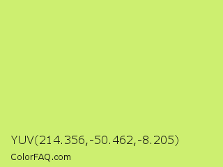 YUV 214.356,-50.462,-8.205 Color is a light lime color and the nearest color is Sulu #c1f07c. Hex code #cdef70 and RGB value is rgb(205,239,112). In RGB color space, this color is composed of 80% red, 94% green, 44% blue, In CMYK color space, this color is composed of 14% cyan, 0% magenta, 53% yellow , 6% black , In HSL color space, this color has a hue angle of 76° , 80% saturation and 69% lightness.