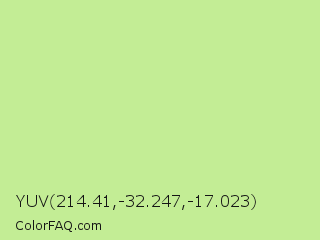 YUV 214.41,-32.247,-17.023 Color is a light green color and the nearest color is Medium Spring Bud #c9dc87. Hex code #c3ed95 and RGB value is rgb(195,237,149). In RGB color space, this color is composed of 76% red, 93% green, 58% blue, In CMYK color space, this color is composed of 18% cyan, 0% magenta, 37% yellow , 7% black , In HSL color space, this color has a hue angle of 89° , 71% saturation and 76% lightness.
