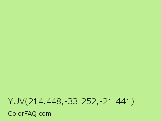 YUV 214.448,-33.252,-21.441 Color is a light green color and the nearest color is Sulu #c1f07c. Hex code #bef093 and RGB value is rgb(190,240,147). In RGB color space, this color is composed of 75% red, 94% green, 58% blue, In CMYK color space, this color is composed of 21% cyan, 0% magenta, 39% yellow , 6% black , In HSL color space, this color has a hue angle of 92° , 76% saturation and 76% lightness.