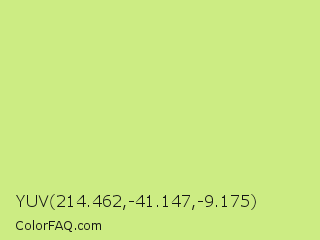 YUV 214.462,-41.147,-9.175 Color is a light lime color and the nearest color is Sulu #c1f07c. Hex code #ccec83 and RGB value is rgb(204,236,131). In RGB color space, this color is composed of 80% red, 93% green, 51% blue, In CMYK color space, this color is composed of 14% cyan, 0% magenta, 44% yellow , 7% black , In HSL color space, this color has a hue angle of 78° , 73% saturation and 72% lightness.