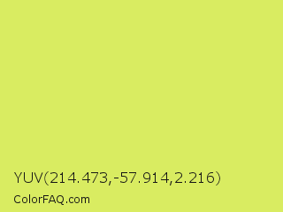 YUV 214.473,-57.914,2.216 Color is a light yellow color and the nearest color is Booger Buster #dde26a. Hex code #d9ec61 and RGB value is rgb(217,236,97). In RGB color space, this color is composed of 85% red, 93% green, 38% blue, In CMYK color space, this color is composed of 8% cyan, 0% magenta, 59% yellow , 7% black , In HSL color space, this color has a hue angle of 68° , 79% saturation and 65% lightness.