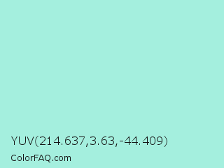 YUV 214.637,3.63,-44.409 Color is a light cyan color and the nearest color is Water Leaf #a1e9de. Hex code #a4efde and RGB value is rgb(164,239,222). In RGB color space, this color is composed of 64% red, 94% green, 87% blue, In CMYK color space, this color is composed of 31% cyan, 0% magenta, 7% yellow , 6% black , In HSL color space, this color has a hue angle of 166° , 70% saturation and 79% lightness.