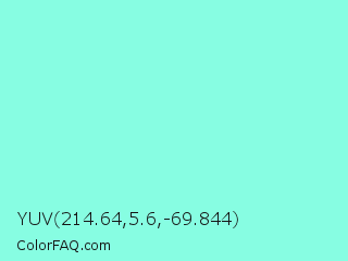 YUV 214.64,5.6,-69.844 Color is a light cyan color and the nearest color is Aquamarine #7fffd4. Hex code #87fde2 and RGB value is rgb(135,253,226). In RGB color space, this color is composed of 53% red, 99% green, 89% blue, In CMYK color space, this color is composed of 47% cyan, 0% magenta, 11% yellow , 1% black , In HSL color space, this color has a hue angle of 166° , 97% saturation and 76% lightness.