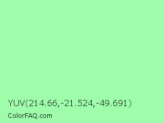 YUV 214.66,-21.524,-49.691 Color is a light green color and the nearest color is Pale Green #98fb98. Hex code #9efcab and RGB value is rgb(158,252,171). In RGB color space, this color is composed of 62% red, 99% green, 67% blue, In CMYK color space, this color is composed of 37% cyan, 0% magenta, 32% yellow , 1% black , In HSL color space, this color has a hue angle of 128° , 94% saturation and 80% lightness.