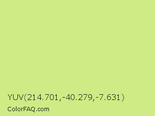 YUV 214.701,-40.279,-7.631 Color is a light lime color and the nearest color is Medium Spring Bud #c9dc87. Hex code #ceeb85 and RGB value is rgb(206,235,133). In RGB color space, this color is composed of 81% red, 92% green, 52% blue, In CMYK color space, this color is composed of 12% cyan, 0% magenta, 43% yellow , 8% black , In HSL color space, this color has a hue angle of 77° , 72% saturation and 72% lightness.