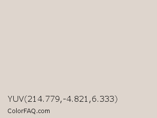 YUV 214.779,-4.821,6.333 Color is a very light orange color and the nearest color is Timberwolf Crayola #d9d6cf. Hex code #ded5cd and RGB value is rgb(222,213,205). In RGB color space, this color is composed of 87% red, 84% green, 80% blue, In CMYK color space, this color is composed of 0% cyan, 4% magenta, 8% yellow , 13% black , In HSL color space, this color has a hue angle of 28° , 20% saturation and 84% lightness.