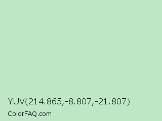 YUV 214.865,-8.807,-21.807 Color is a very light green color and the nearest color is Madang #b7f0be. Hex code #bee7c5 and RGB value is rgb(190,231,197). In RGB color space, this color is composed of 75% red, 91% green, 77% blue, In CMYK color space, this color is composed of 18% cyan, 0% magenta, 15% yellow , 9% black , In HSL color space, this color has a hue angle of 130° , 46% saturation and 83% lightness.