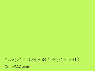 YUV 214.928,-58.139,-19.231 Color is a light green color and the nearest color is Inchworm #b2ec5d. Hex code #c1f961 and RGB value is rgb(193,249,97). In RGB color space, this color is composed of 76% red, 98% green, 38% blue, In CMYK color space, this color is composed of 22% cyan, 0% magenta, 61% yellow , 2% black , In HSL color space, this color has a hue angle of 82° , 93% saturation and 68% lightness.