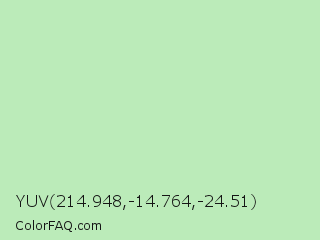 YUV 214.948,-14.764,-24.51 Color is a very light green color and the nearest color is Madang #b7f0be. Hex code #bbebb9 and RGB value is rgb(187,235,185). In RGB color space, this color is composed of 73% red, 92% green, 73% blue, In CMYK color space, this color is composed of 20% cyan, 0% magenta, 21% yellow , 8% black , In HSL color space, this color has a hue angle of 118° , 56% saturation and 82% lightness.