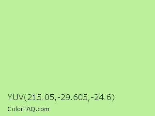 YUV 215.05,-29.605,-24.6 Color is a light green color and the nearest color is Reef #c9ffa2. Hex code #bbf19b and RGB value is rgb(187,241,155). In RGB color space, this color is composed of 73% red, 95% green, 61% blue, In CMYK color space, this color is composed of 22% cyan, 0% magenta, 36% yellow , 5% black , In HSL color space, this color has a hue angle of 98° , 75% saturation and 78% lightness.