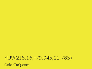 YUV 215.16,-79.945,21.785 Color is a normal yellow color and the nearest color is Dandelion #f0e130. Hex code #f0ea35 and RGB value is rgb(240,234,53). In RGB color space, this color is composed of 94% red, 92% green, 21% blue, In CMYK color space, this color is composed of 0% cyan, 3% magenta, 78% yellow , 6% black , In HSL color space, this color has a hue angle of 58° , 86% saturation and 57% lightness.