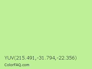 YUV 215.491,-31.794,-22.356 Color is a light green color and the nearest color is Reef #c9ffa2. Hex code #bef197 and RGB value is rgb(190,241,151). In RGB color space, this color is composed of 75% red, 95% green, 59% blue, In CMYK color space, this color is composed of 21% cyan, 0% magenta, 37% yellow , 5% black , In HSL color space, this color has a hue angle of 94° , 76% saturation and 77% lightness.
