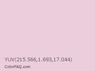 YUV 215.566,1.693,17.044 Color is a very light rose color and the nearest color is Queen Pink #e8ccd7. Hex code #ebcddb and RGB value is rgb(235,205,219). In RGB color space, this color is composed of 92% red, 80% green, 86% blue, In CMYK color space, this color is composed of 0% cyan, 13% magenta, 7% yellow , 8% black , In HSL color space, this color has a hue angle of 332° , 43% saturation and 86% lightness.
