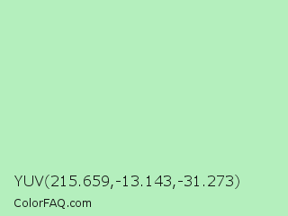 YUV 215.659,-13.143,-31.273 Color is a very light green color and the nearest color is Madang #b7f0be. Hex code #b4efbd and RGB value is rgb(180,239,189). In RGB color space, this color is composed of 71% red, 94% green, 74% blue, In CMYK color space, this color is composed of 25% cyan, 0% magenta, 21% yellow , 6% black , In HSL color space, this color has a hue angle of 129° , 65% saturation and 82% lightness.