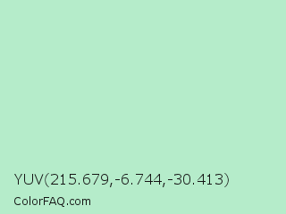 YUV 215.679,-6.744,-30.413 Color is a very light green color and the nearest color is Padua #ade6c4. Hex code #b5ecca and RGB value is rgb(181,236,202). In RGB color space, this color is composed of 71% red, 93% green, 79% blue, In CMYK color space, this color is composed of 23% cyan, 0% magenta, 14% yellow , 7% black , In HSL color space, this color has a hue angle of 143° , 59% saturation and 82% lightness.