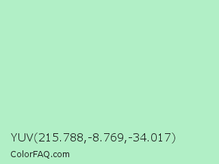 YUV 215.788,-8.769,-34.017 Color is a very light green color and the nearest color is Madang #b7f0be. Hex code #b1efc6 and RGB value is rgb(177,239,198). In RGB color space, this color is composed of 69% red, 94% green, 78% blue, In CMYK color space, this color is composed of 26% cyan, 0% magenta, 17% yellow , 6% black , In HSL color space, this color has a hue angle of 140° , 66% saturation and 82% lightness.