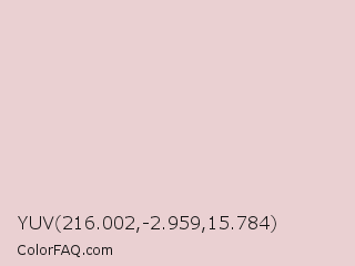 YUV 216.002,-2.959,15.784 Color is a very light red color and the nearest color is Oyster Pink #e9cecd. Hex code #ead0d2 and RGB value is rgb(234,208,210). In RGB color space, this color is composed of 92% red, 82% green, 82% blue, In CMYK color space, this color is composed of 0% cyan, 11% magenta, 10% yellow , 8% black , In HSL color space, this color has a hue angle of 355° , 38% saturation and 87% lightness.