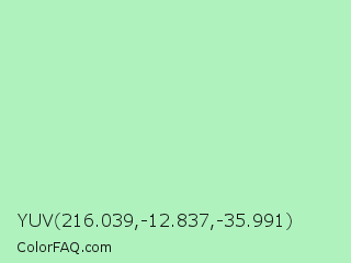 YUV 216.039,-12.837,-35.991 Color is a very light green color and the nearest color is Madang #b7f0be. Hex code #aff2be and RGB value is rgb(175,242,190). In RGB color space, this color is composed of 69% red, 95% green, 75% blue, In CMYK color space, this color is composed of 28% cyan, 0% magenta, 21% yellow , 5% black , In HSL color space, this color has a hue angle of 133° , 72% saturation and 82% lightness.