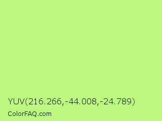 YUV 216.266,-44.008,-24.789 Color is a light green color and the nearest color is Sulu #c1f07c. Hex code #bcf87f and RGB value is rgb(188,248,127). In RGB color space, this color is composed of 74% red, 97% green, 50% blue, In CMYK color space, this color is composed of 24% cyan, 0% magenta, 49% yellow , 3% black , In HSL color space, this color has a hue angle of 90° , 90% saturation and 74% lightness.