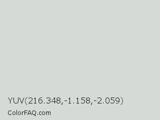 YUV 216.348,-1.158,-2.059 Color is a very light green color and the nearest color is Iron #d4d7d9. Hex code #d6dad6 and RGB value is rgb(214,218,214). In RGB color space, this color is composed of 84% red, 85% green, 84% blue, In CMYK color space, this color is composed of 2% cyan, 0% magenta, 2% yellow , 15% black , In HSL color space, this color has a hue angle of 120° , 5% saturation and 85% lightness.