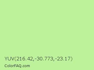 YUV 216.42,-30.773,-23.17 Color is a light green color and the nearest color is Reef #c9ffa2. Hex code #bef29a and RGB value is rgb(190,242,154). In RGB color space, this color is composed of 75% red, 95% green, 60% blue, In CMYK color space, this color is composed of 21% cyan, 0% magenta, 36% yellow , 5% black , In HSL color space, this color has a hue angle of 95° , 77% saturation and 78% lightness.
