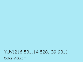 YUV 216.531,14.528,-39.931 Color is a very light cyan color and the nearest color is Blizzard Blue #ace5ee. Hex code #abeaf6 and RGB value is rgb(171,234,246). In RGB color space, this color is composed of 67% red, 92% green, 96% blue, In CMYK color space, this color is composed of 30% cyan, 5% magenta, 0% yellow , 4% black , In HSL color space, this color has a hue angle of 190° , 81% saturation and 82% lightness.