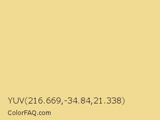 YUV 216.669,-34.84,21.338 Color is a light orange color and the nearest color is Chalky #eed794. Hex code #f1da92 and RGB value is rgb(241,218,146). In RGB color space, this color is composed of 95% red, 85% green, 57% blue, In CMYK color space, this color is composed of 0% cyan, 10% magenta, 39% yellow , 5% black , In HSL color space, this color has a hue angle of 45° , 77% saturation and 76% lightness.