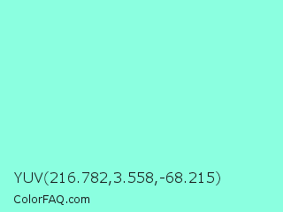 YUV 216.782,3.558,-68.215 Color is a light cyan color and the nearest color is Aquamarine #7fffd4. Hex code #8bffe0 and RGB value is rgb(139,255,224). In RGB color space, this color is composed of 55% red, 100% green, 88% blue, In CMYK color space, this color is composed of 45% cyan, 0% magenta, 12% yellow , 0% black , In HSL color space, this color has a hue angle of 164° , 100% saturation and 77% lightness.