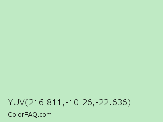 YUV 216.811,-10.26,-22.636 Color is a very light green color and the nearest color is Madang #b7f0be. Hex code #bfeac4 and RGB value is rgb(191,234,196). In RGB color space, this color is composed of 75% red, 92% green, 77% blue, In CMYK color space, this color is composed of 18% cyan, 0% magenta, 16% yellow , 8% black , In HSL color space, this color has a hue angle of 127° , 51% saturation and 83% lightness.