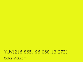 YUV 216.865,-96.068,13.273 Color is a normal yellow color and the nearest color is Piss Yellow #e1e115. Hex code #e8f716 and RGB value is rgb(232,247,22). In RGB color space, this color is composed of 91% red, 97% green, 9% blue, In CMYK color space, this color is composed of 6% cyan, 0% magenta, 91% yellow , 3% black , In HSL color space, this color has a hue angle of 64° , 93% saturation and 53% lightness.