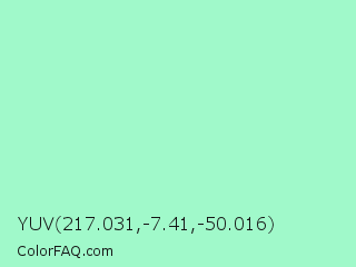 YUV 217.031,-7.41,-50.016 Color is a light green color and the nearest color is Magic Mint #aaf0d1. Hex code #a0f9ca and RGB value is rgb(160,249,202). In RGB color space, this color is composed of 63% red, 98% green, 79% blue, In CMYK color space, this color is composed of 36% cyan, 0% magenta, 19% yellow , 2% black , In HSL color space, this color has a hue angle of 148° , 88% saturation and 80% lightness.
