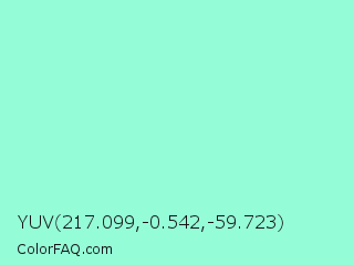 YUV 217.099,-0.542,-59.723 Color is a light green color and the nearest color is Aquamarine #7fffd4. Hex code #95fcd8 and RGB value is rgb(149,252,216). In RGB color space, this color is composed of 58% red, 99% green, 85% blue, In CMYK color space, this color is composed of 41% cyan, 0% magenta, 14% yellow , 1% black , In HSL color space, this color has a hue angle of 159° , 94% saturation and 79% lightness.