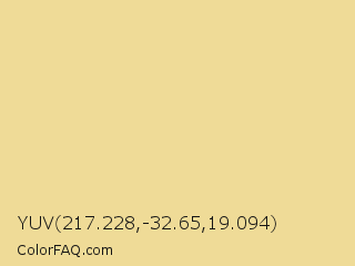 YUV 217.228,-32.65,19.094 Color is a light yellow color and the nearest color is Chalky #eed794. Hex code #efdb97 and RGB value is rgb(239,219,151). In RGB color space, this color is composed of 94% red, 86% green, 59% blue, In CMYK color space, this color is composed of 0% cyan, 8% magenta, 37% yellow , 6% black , In HSL color space, this color has a hue angle of 46° , 73% saturation and 76% lightness.