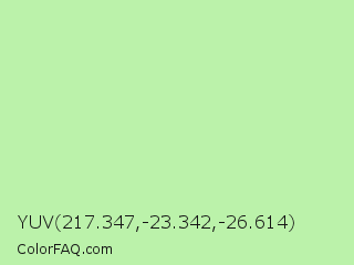 YUV 217.347,-23.342,-26.614 Color is a very light green color and the nearest color is Madang #b7f0be. Hex code #bbf2aa and RGB value is rgb(187,242,170). In RGB color space, this color is composed of 73% red, 95% green, 67% blue, In CMYK color space, this color is composed of 23% cyan, 0% magenta, 30% yellow , 5% black , In HSL color space, this color has a hue angle of 106° , 73% saturation and 81% lightness.