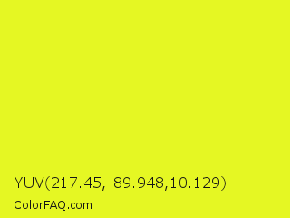 YUV 217.45,-89.948,10.129 Color is a normal yellow color and the nearest color is Piss Yellow #e1e115. Hex code #e5f723 and RGB value is rgb(229,247,35). In RGB color space, this color is composed of 90% red, 97% green, 14% blue, In CMYK color space, this color is composed of 7% cyan, 0% magenta, 86% yellow , 3% black , In HSL color space, this color has a hue angle of 65° , 93% saturation and 55% lightness.